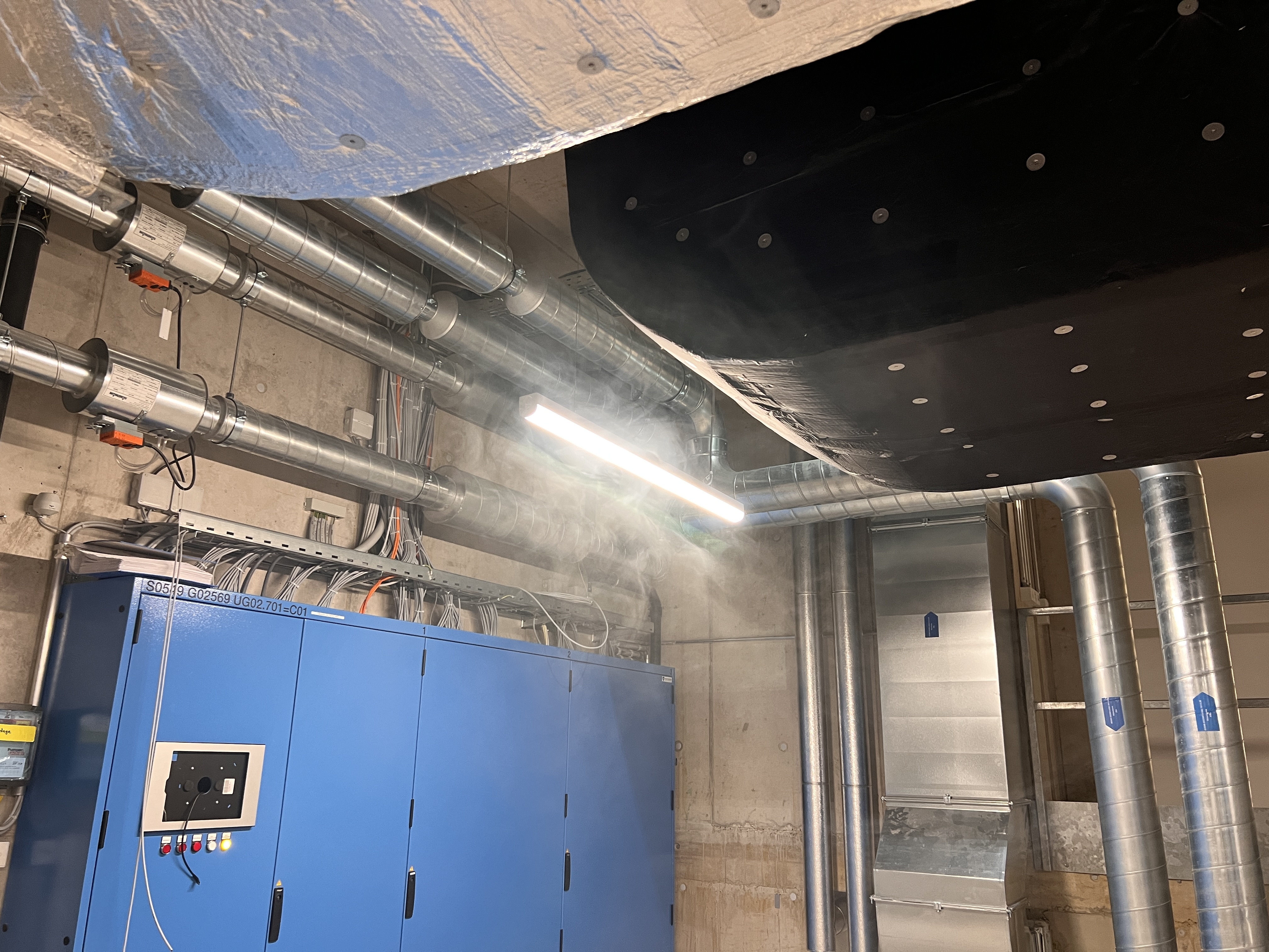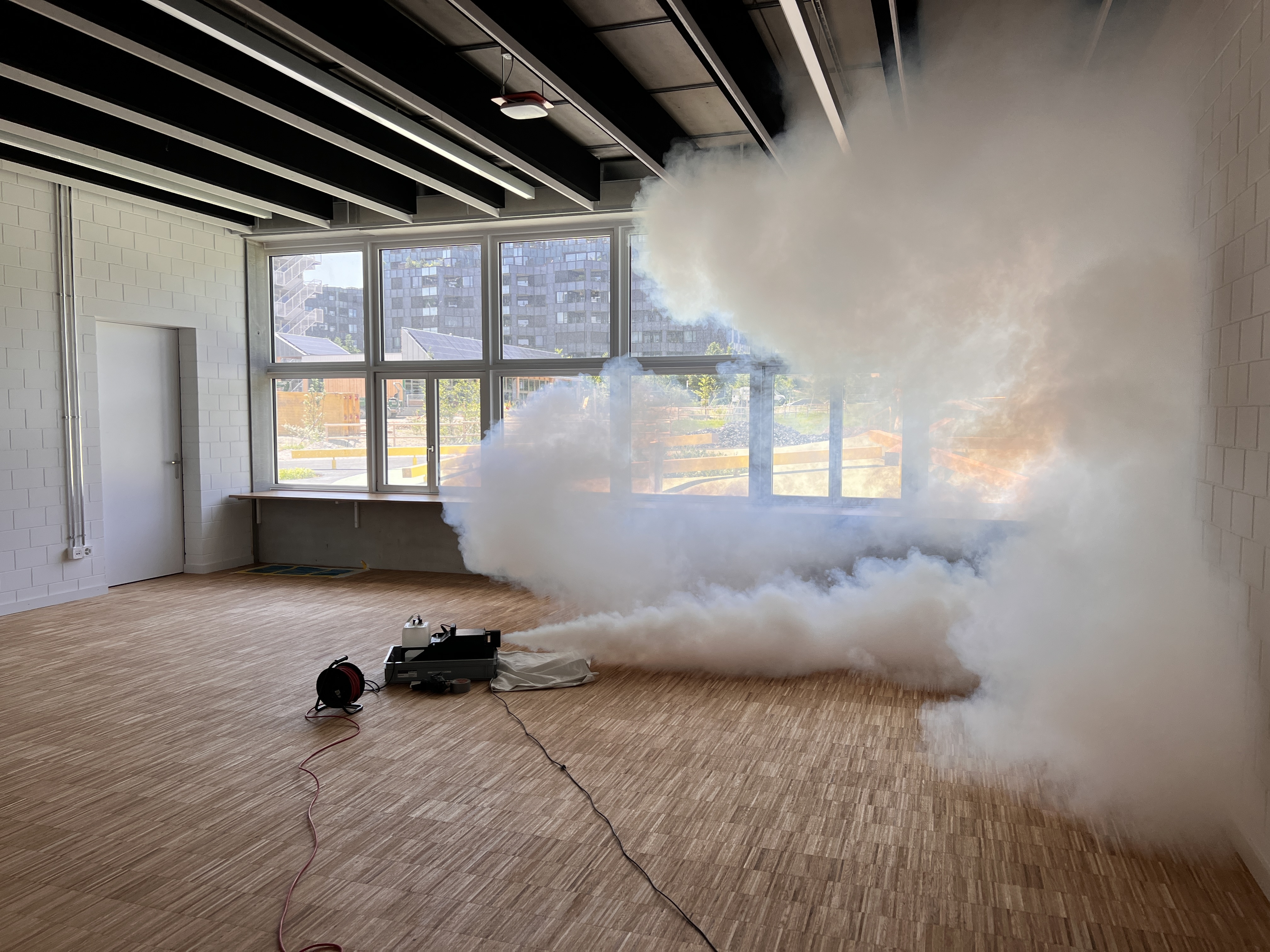 Gebäudediagnose mit Verdampfer-Nebelmaschine. Eingesetzt wird eine für Mensch, Tier und alle Arten von Wohnungs- oder Büroeinrichtungen unbedenkliche Nebelflüssigkeit.